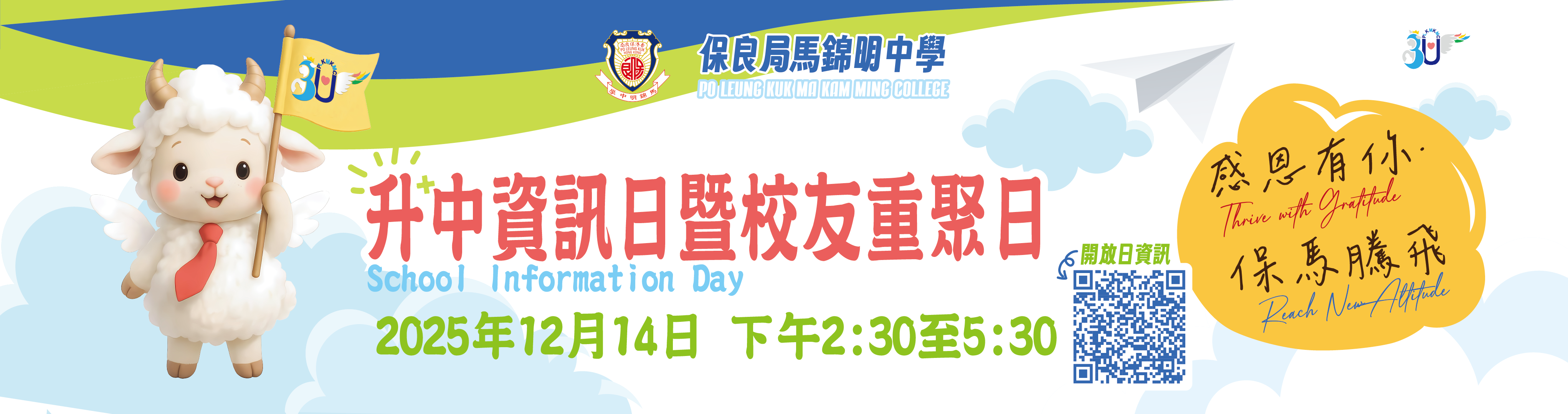 2) 原訂於 2025 年 12 月 14 日(星期日)舉行的下午開放日將改為「升中資訊日暨校友重聚日」,活動時間調整為下午 2:30 至 5:30,歡迎校外嘉賓、公眾人士、中小學學生及家長、本校校友、本校學生及家長出席。是次活動無需報名。