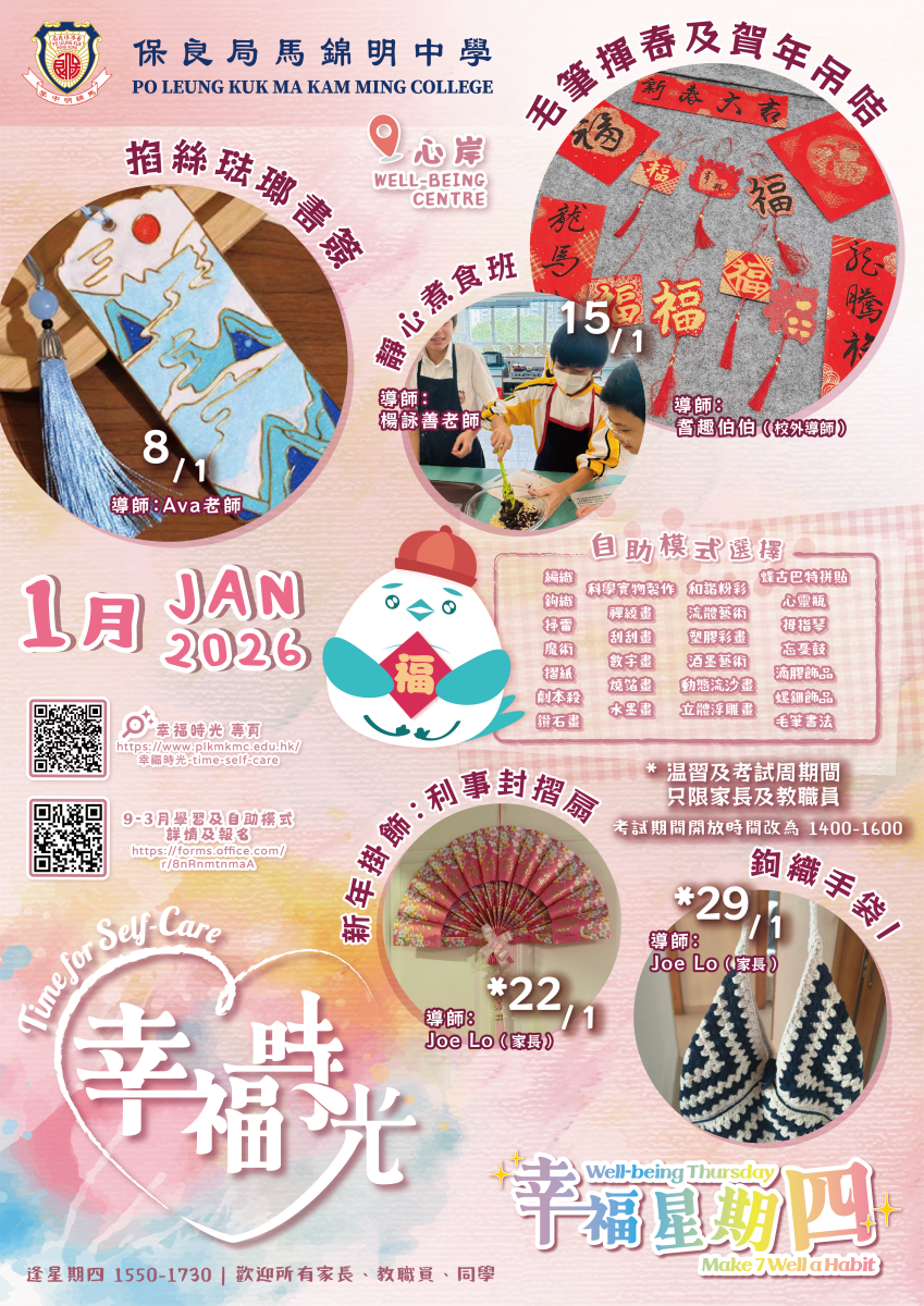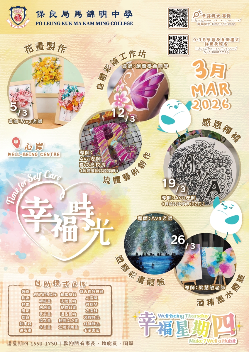 逢星期四下午3:50 - 5:30,是「保馬人」專屬的幸福時光。歡迎您來到心岸,參與各種有助提升身心靈健康的活動,並建立恆常自我照顧習慣。
