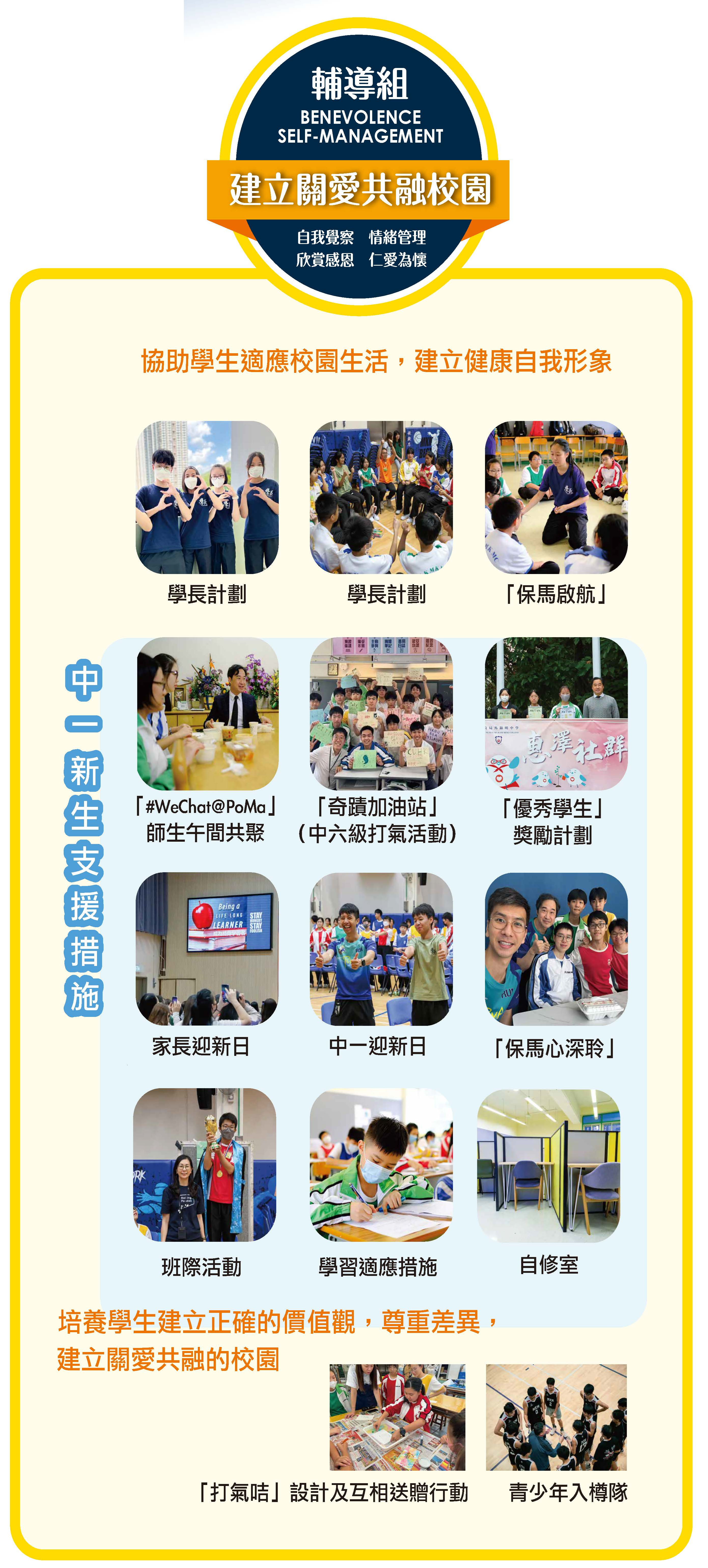 The Guidance & Counselling Committee aims to create a culture of caring in the campus through individual counselling, group counselling and school activities. It strives to support students with different needs, assist students to adapt to the changes in different learning stages, enhance students' well-being and resilience.