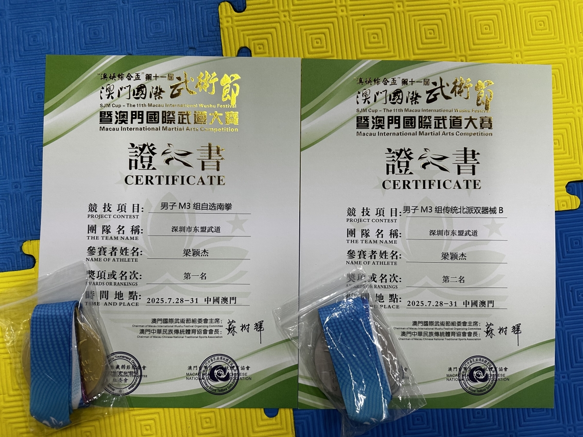 2B梁穎傑於〈第十一屆澳門國際武術節「澳娛綜合盃」:暨澳門國際武道大賽〉榮獲第一名、第二名(體育科)