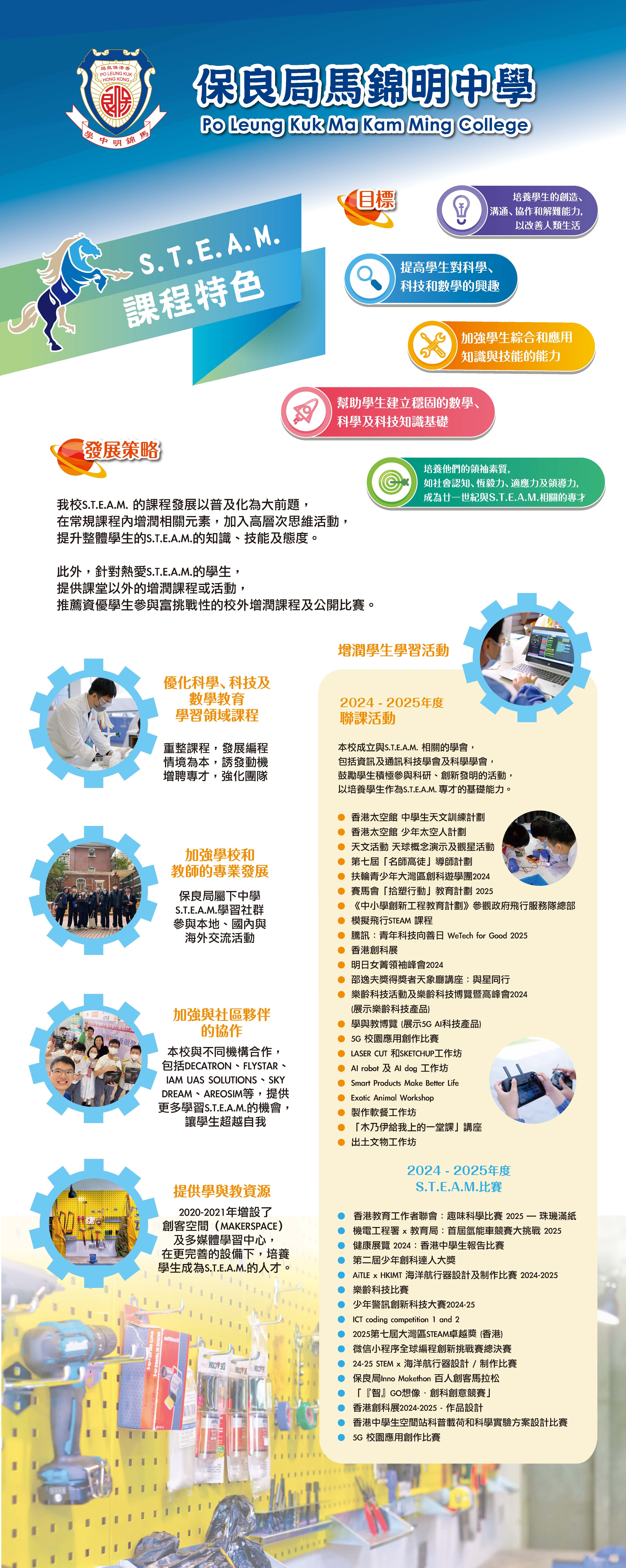 本校成立與S.T.E.A.M. 相關的學會,包括資料及通訊科技學會、科學學會、數學學會,鼓勵學生積極參與科研、創新發明的活動,以培養學生作為S.T.E.A.M.專才的基礎能力。本校積極推動與S.T.E.A.M.有關的學習活動,以回應校本S.T.E.A.M.發展目標。